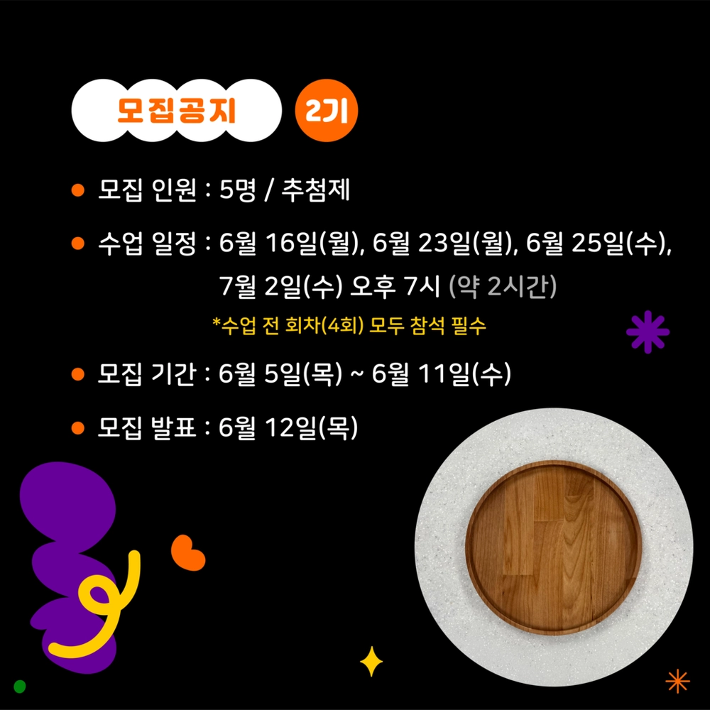 · 수업 일시 : 6월 16일(월), 6월 23일(월), 6월 25일(수), 7월 2일(수) / 오후 7시 (약 2시간)