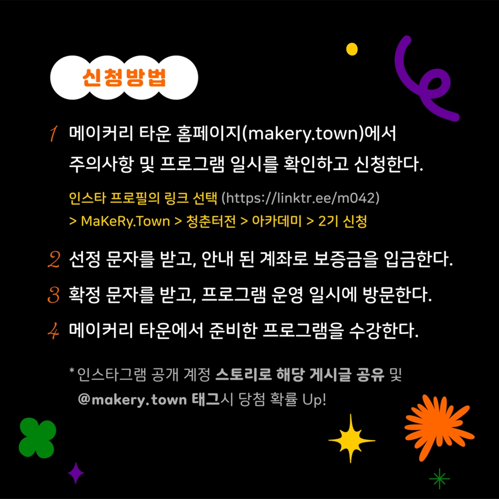 • 방법 : 프로필 링크 https://linktr.ee/m042 > MaKeRy.Town > 청춘터전 > 아카데미