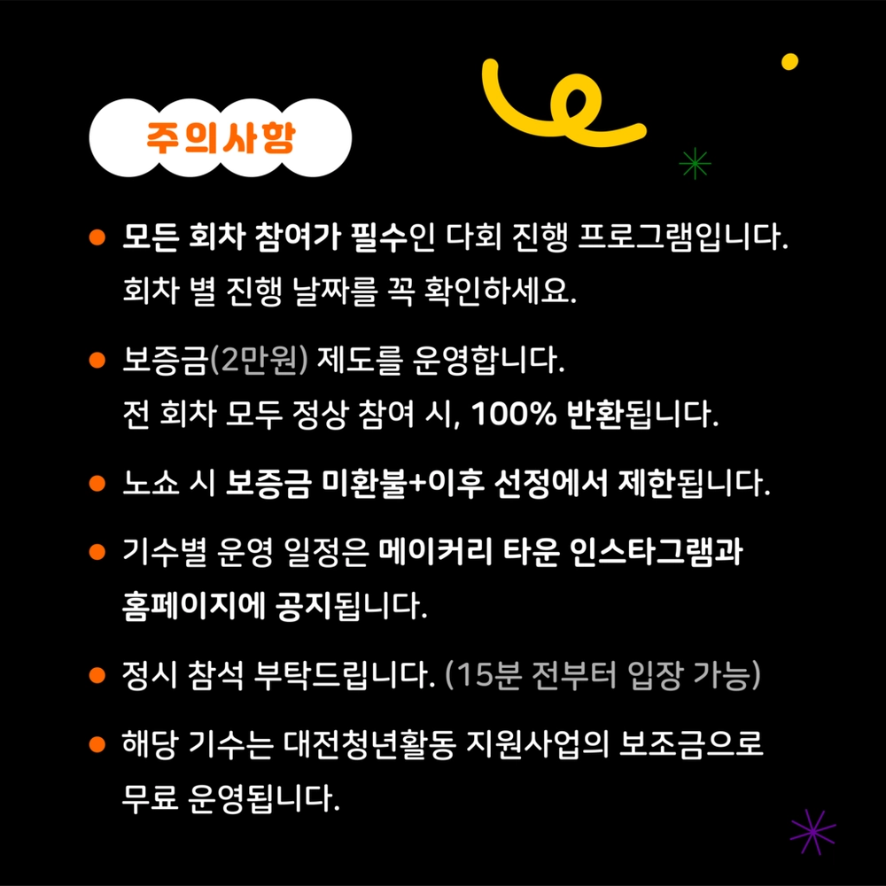 • 노쇼 시 보증금 미환불+이후 선정에서 제한됩니다.