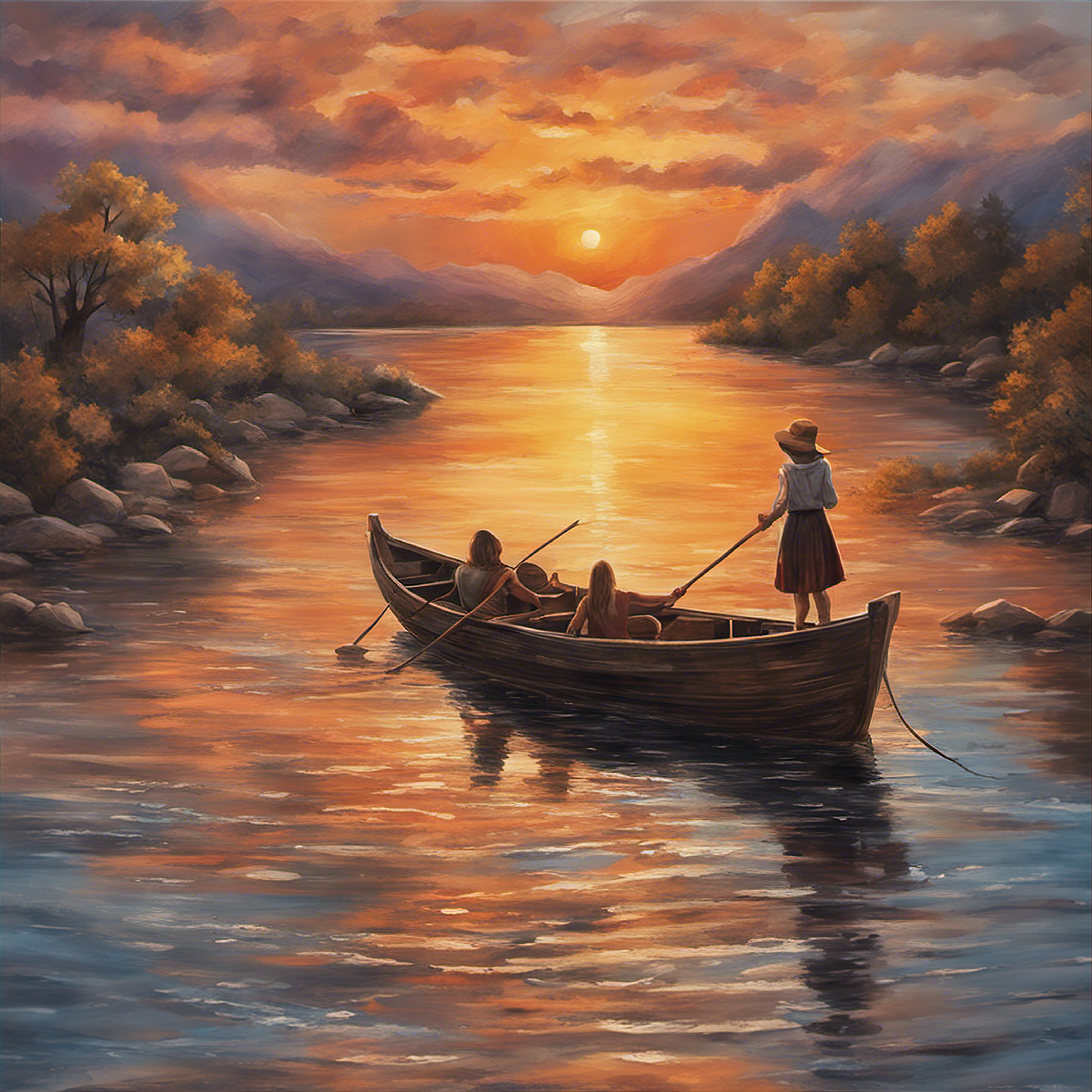 해가 지는 노을, 강, 배를 타고있다. 친구들과 자유롭게.