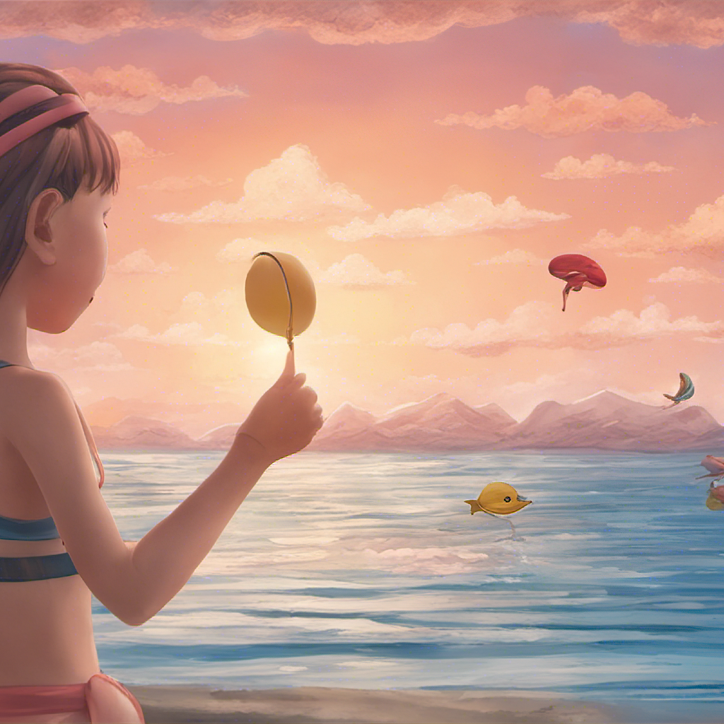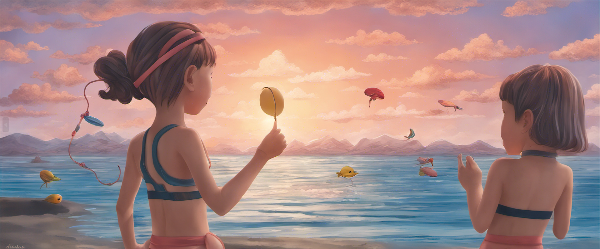 | 해가 뜨는 아침, 바다, 신나게 수영해요. 친구 윤이랑 함께 있고 부모님은 수영복 가지러 숙소 갔어요. 너무 심심해서 줄넘기나 요요 등 운동을 잘하고 싶어요. 그려려면 열심히 연습해야 해. Morning sunrise, Sea Joyful Swimming with friend yoon Parents going to get swimwear. Feeling bored want to practice exercise like jump rope or yoyo. To become good at exercise like jump rope or yoyo you have to practice diligently. |