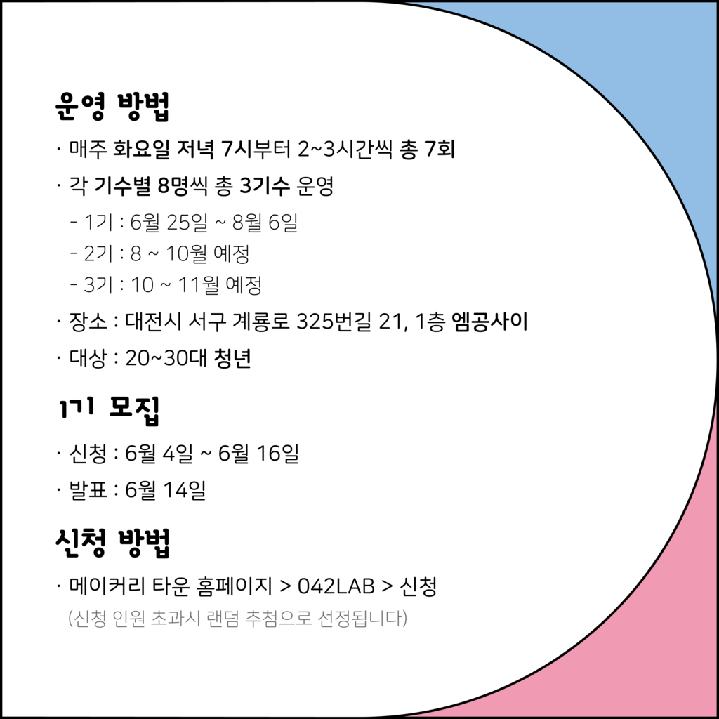 · 1๊ธฐ : 6์ 25์ผ ~ 8์ 6์ผ (๋งค์ฃผ ํ์์ผ)