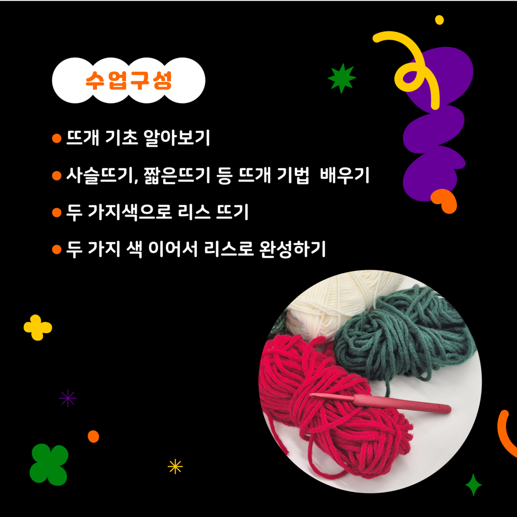 체험 후 따뜻한 겨울 취미를 위해 코바늘과 추가 실(랜덤 색상) 제공합니다.