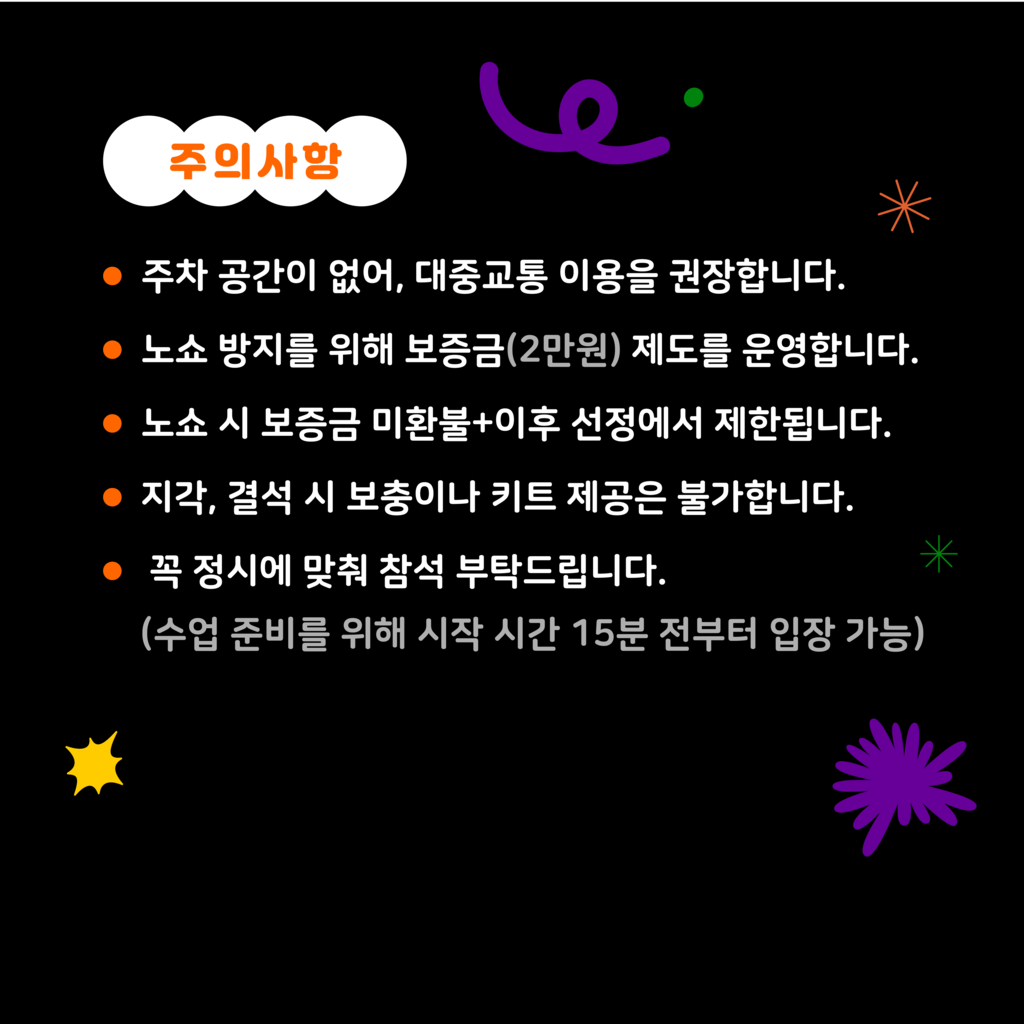 • 지각, 결석 시 보충이나 키트 제공은 불가합니다.