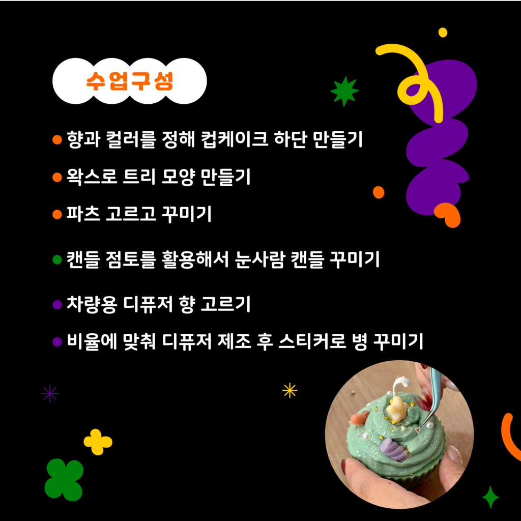 크리스마스 트리와 마시멜로우 눈사람 모양의 캔들 미니 차량용 방향제도 함께 만드는 클래스