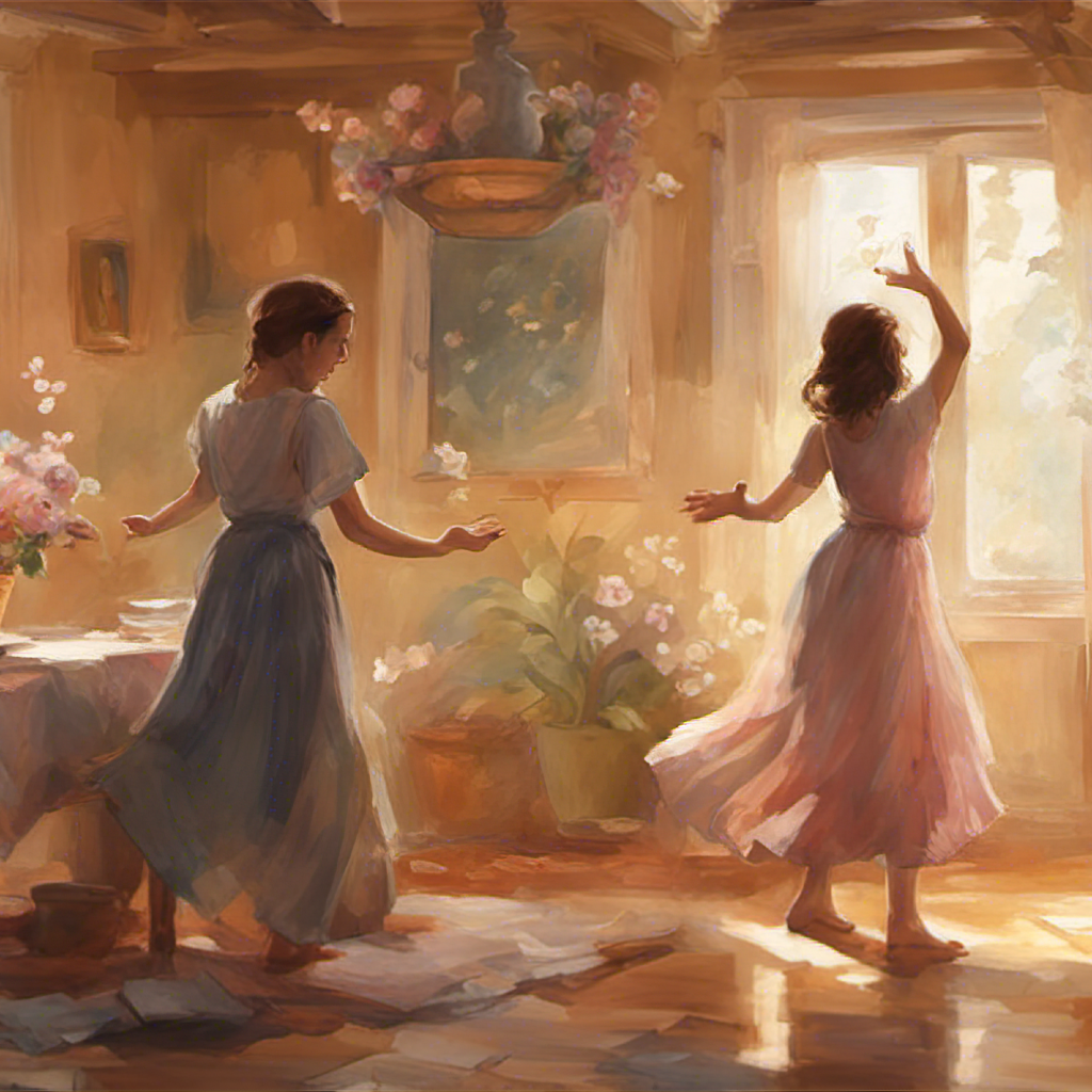| 해가 뜨는 아침, 따뜻한 집안, 종이접기 하고 춤추기 엄마 아빠와 함께. 그림을 그리기 위해, 아이돌이 되기 위해 춤을 많이 춰요. Create an image depicting a sunny morning with a warm atmosphere inside a house. Show someone folding paper and dancing joyfully. The person is accompanied by their parents. The purpose of their dance is to become an idol and they dance a lot to achieve that goal. |