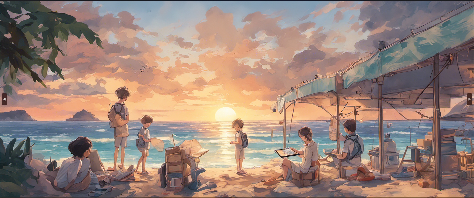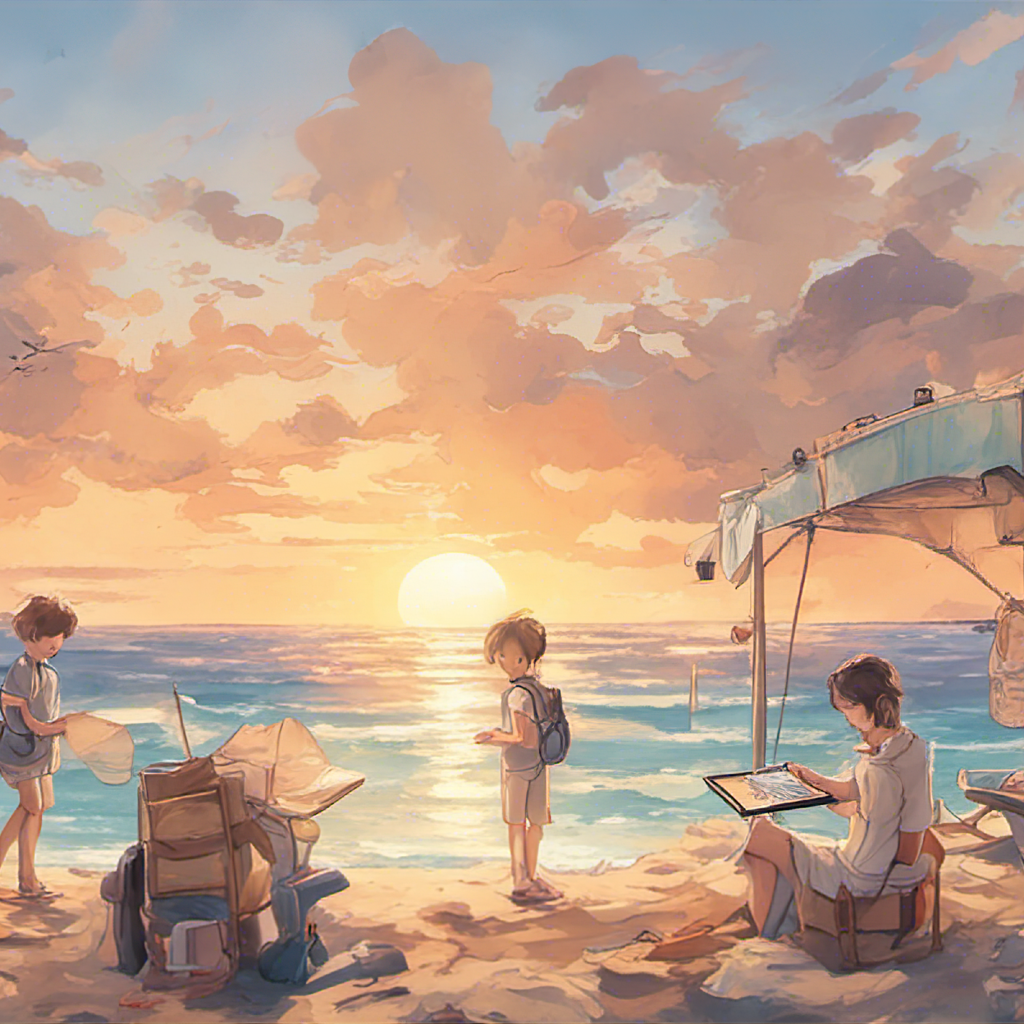 | 해가 뜨는 아침 바닷가에서 스킨스쿠버, 탭으로 공부 가족들과 함께 나를 소개하기 위해 열심히 공부. Create an image that represents the following prompt. A sunrise morning at the beach, scuba diving studying with a tablet with family to introduce myself diligently studying. |
