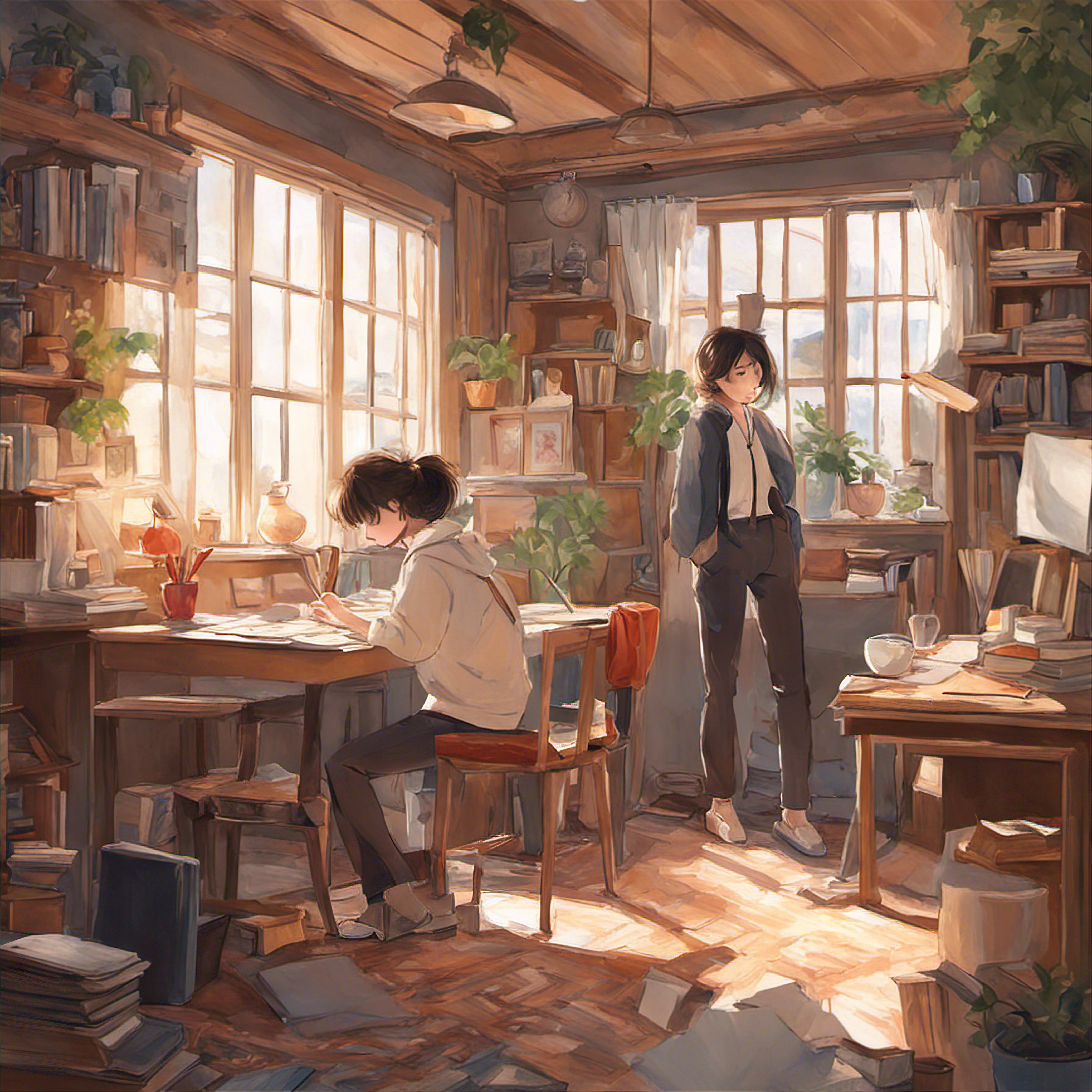 | 해, 아늑한 실내, 이야기, 함께, 미술선생님, 그림을 열심히 그려야겠다. Draw a cozy indoor scene where you are accompanied by an art teacher engrossed in telling a story and diligently creating a beautiful painting. |